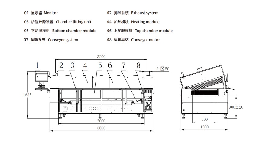 1.可選:機頭機尾可凸出,凸出上爐膛外側面尺寸300mm(整機尺寸會加長600mm)。 2.注明:根據產能要求,推薦溫區數量優先選擇:4溫區、5溫區、 8溫區、9溫區、10溫區、12溫區,可定制。 |