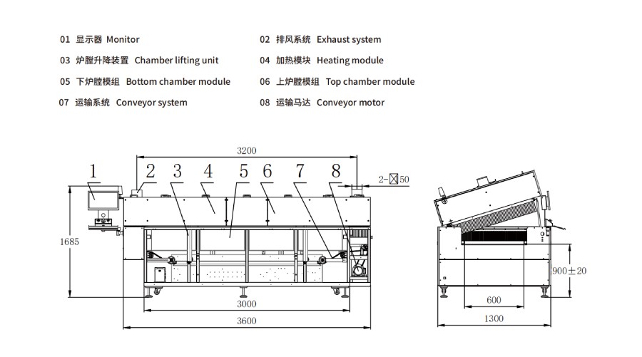 1.可選:機頭機尾可凸出,凸出上爐膛外側(cè)面尺寸300mm(整機尺寸會加長600mm)。 2.注明:根據(jù)產(chǎn)能要求,推薦溫區(qū)數(shù)量優(yōu)先選擇:4溫區(qū)、5溫區(qū)、 8溫區(qū)、9溫區(qū)、10溫區(qū)、12溫區(qū),可定制。 |