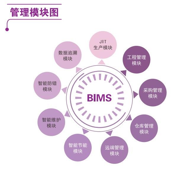 BIMS系統(tǒng)以模塊化的方式提供了一系列獨(dú)特的管理工具及方法,可重構(gòu)生產(chǎn)管理系統(tǒng)或制造執(zhí)行系統(tǒng)。自主研發(fā)的快速重構(gòu)機(jī)制,可根據(jù)客戶業(yè)務(wù)需求,系統(tǒng)各模塊可靈活組裝并深度定制。可快速添加新功能,使BIMS系統(tǒng)更好的延展。從基本功能架構(gòu)上看,BIMS系統(tǒng)的主要功能包括:JIT生產(chǎn)、數(shù)據(jù)追溯。智能防錯(cuò)、智能維護(hù)、智能節(jié)能、遠(yuǎn)端管理、倉庫管理、采購管理和工程管理。實(shí)際的客戶系統(tǒng)詳細(xì)功能因需定制,與標(biāo)準(zhǔn)的功能架構(gòu)有所偏差。